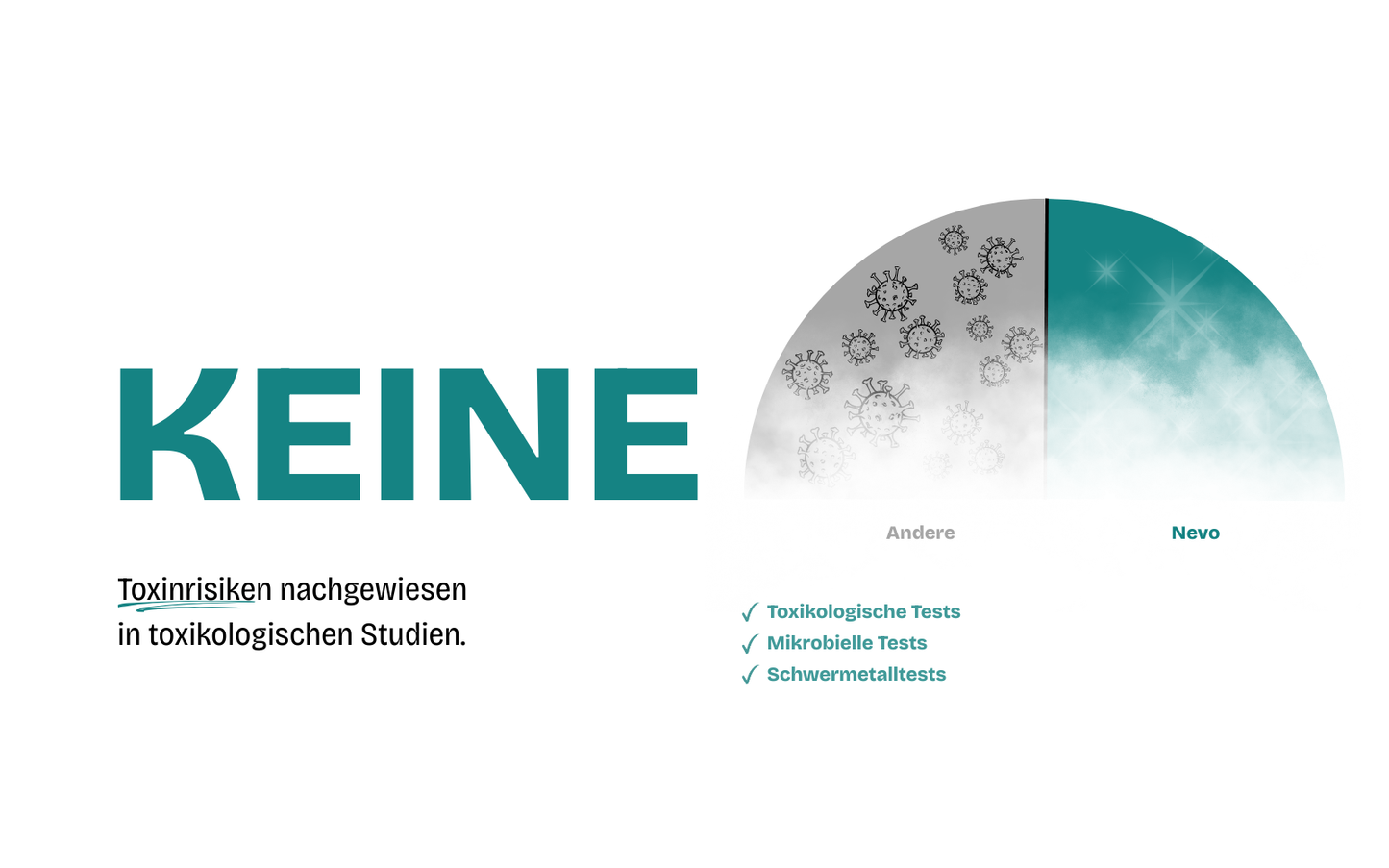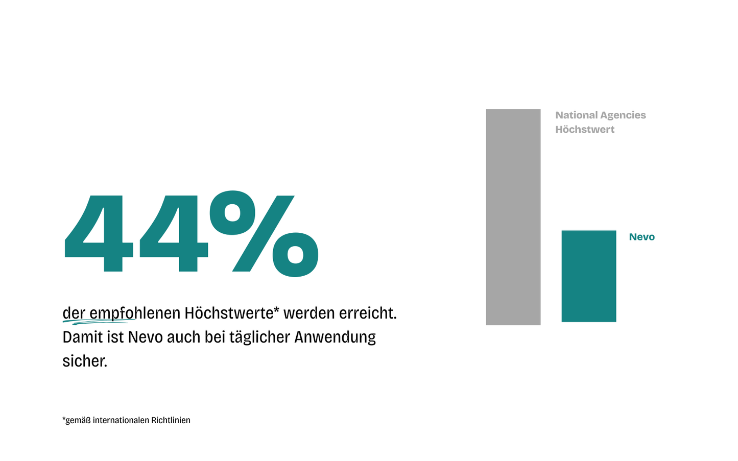 Nur 44 % der empfohlenen Höchstwerte (gemäß internationalen Richtlinien) werden erreicht – damit ist Nevo auch bei täglicher Anwendung sicher.