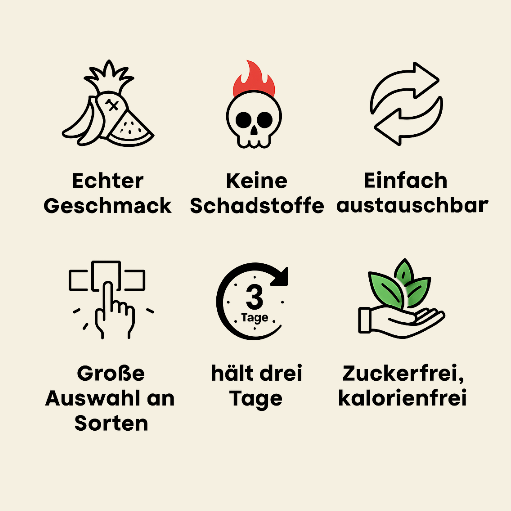 Nevo Cores enthalten kein Nikotin, keinen Zucker und keine Kalorien. Es wird nichts verbrannt oder verdampft – du atmest lediglich aromatisierte Luft ein.